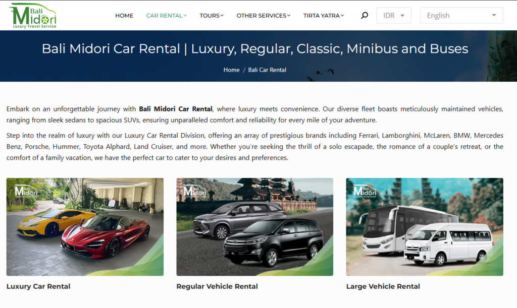 Bali Midori is a well-established car rental service based in Denpasar, Bali, offering a range of reliable and affordable transportation options for travelers. With operations since 2007, the company specializes in regular car rentals, airport transfers, and private tours, catering to both individual and group travelers.